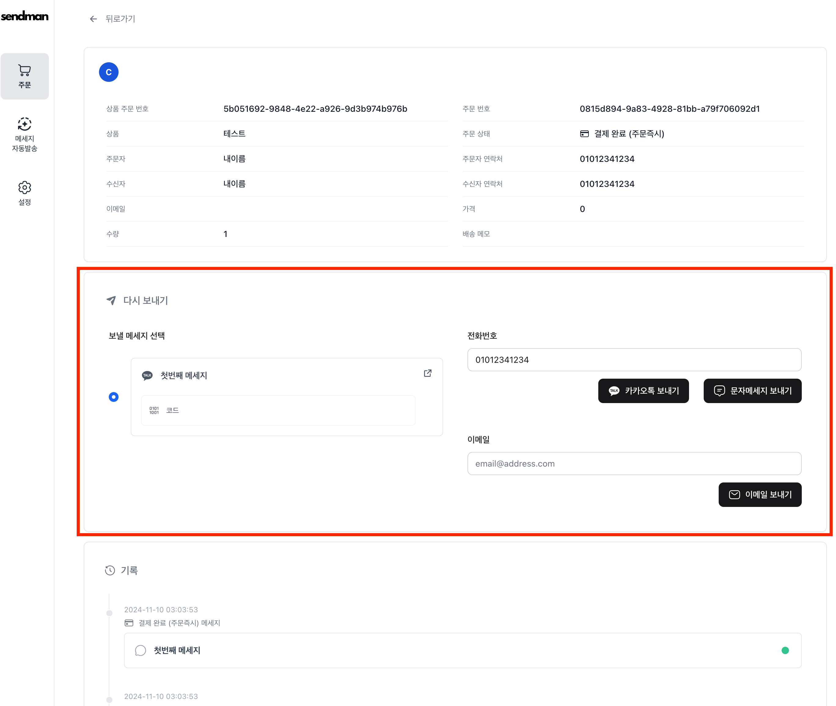[주문] 페이지에서 각 주문 상세페이지로 가셔서 "다시 보내기" 기능을 이용하시면 됩니다.