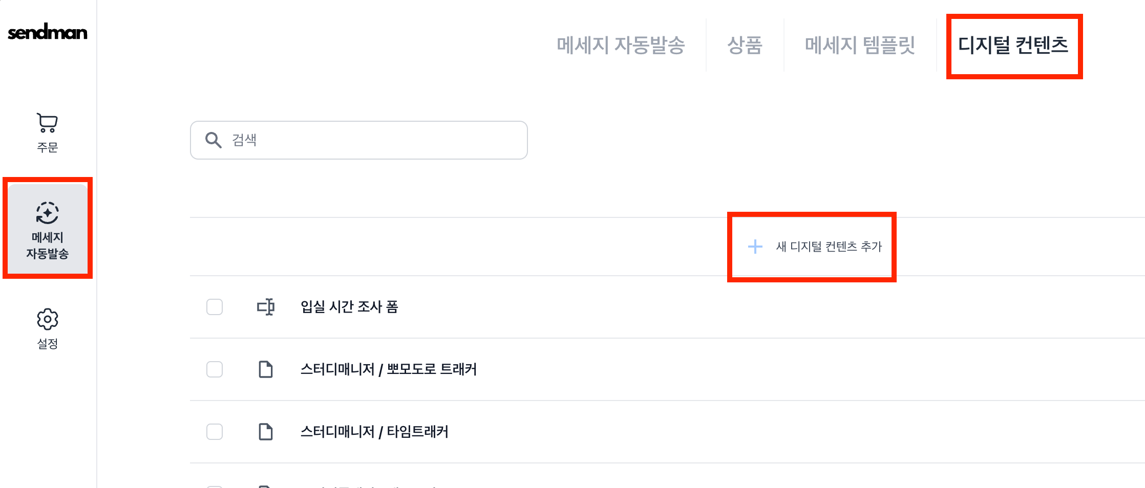 [메세지 자동발송] - [디지털 컨텐츠] 메뉴에서 "새 디지털 컨텐츠 추가"를 눌러주세요