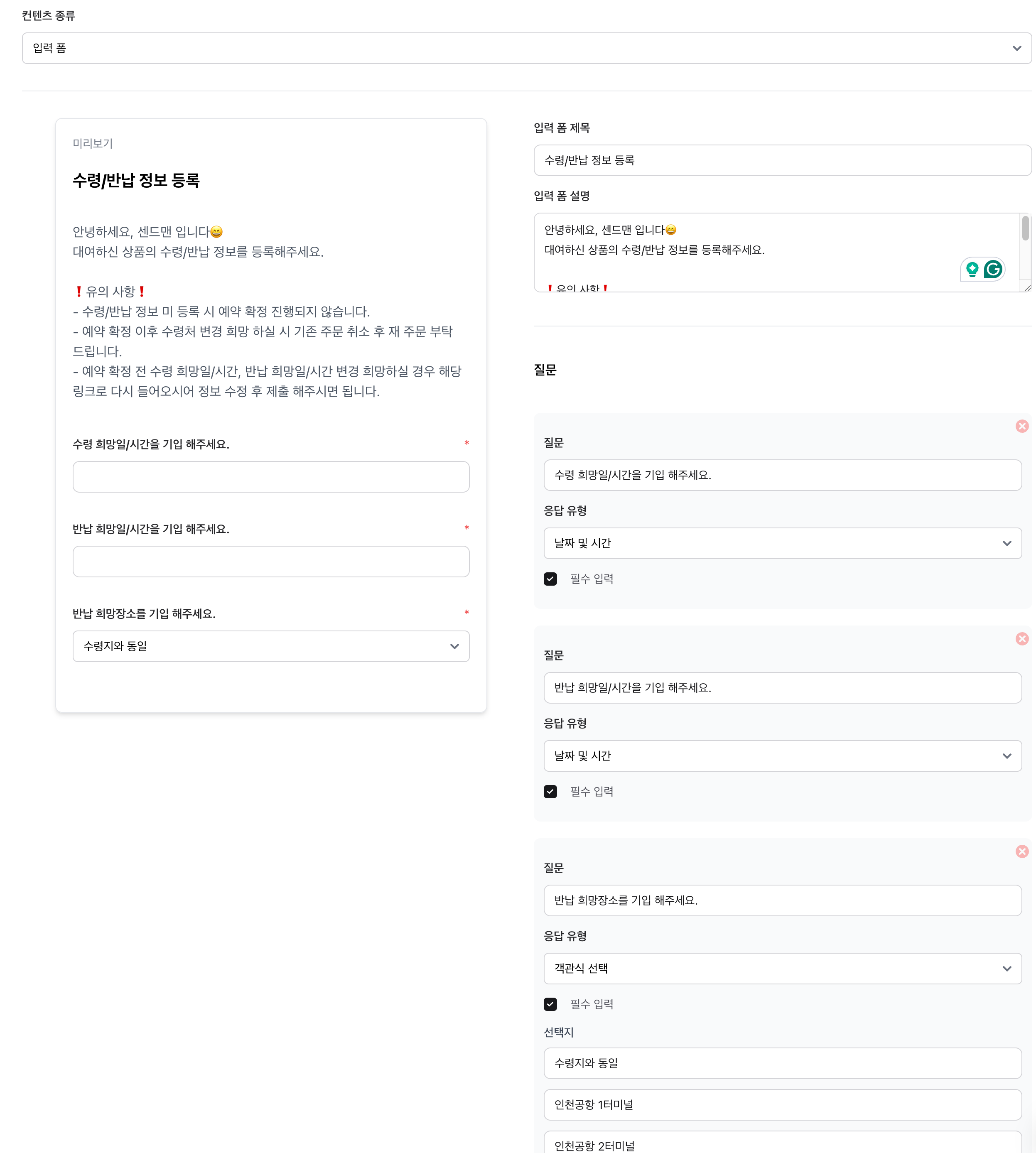 컨텐츠 종류를 "입력 폼"으로 만들고 원하는 질문들을 채워주세요.