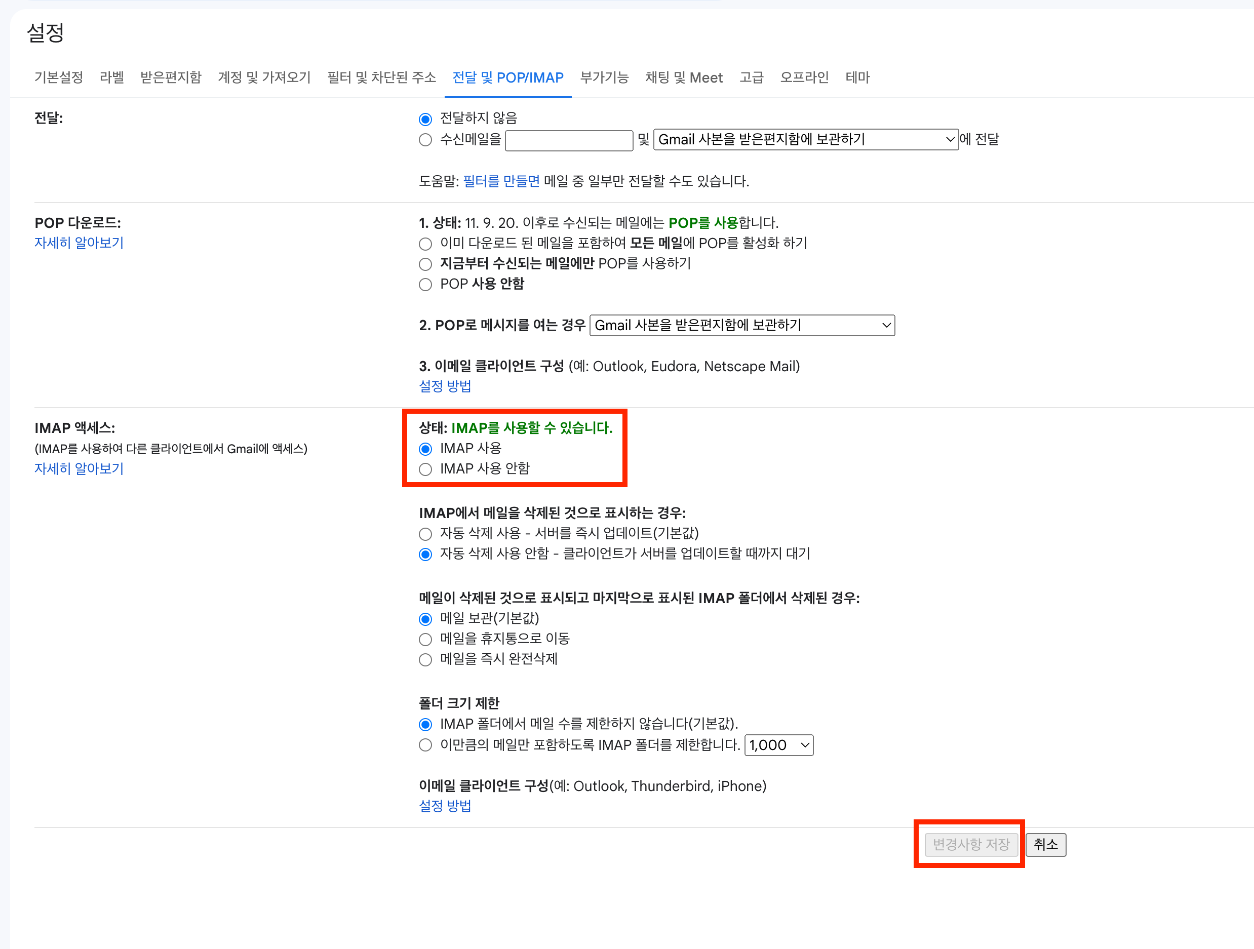 IMAP 액세스 항목에서 "IMAP 사용" 클릭