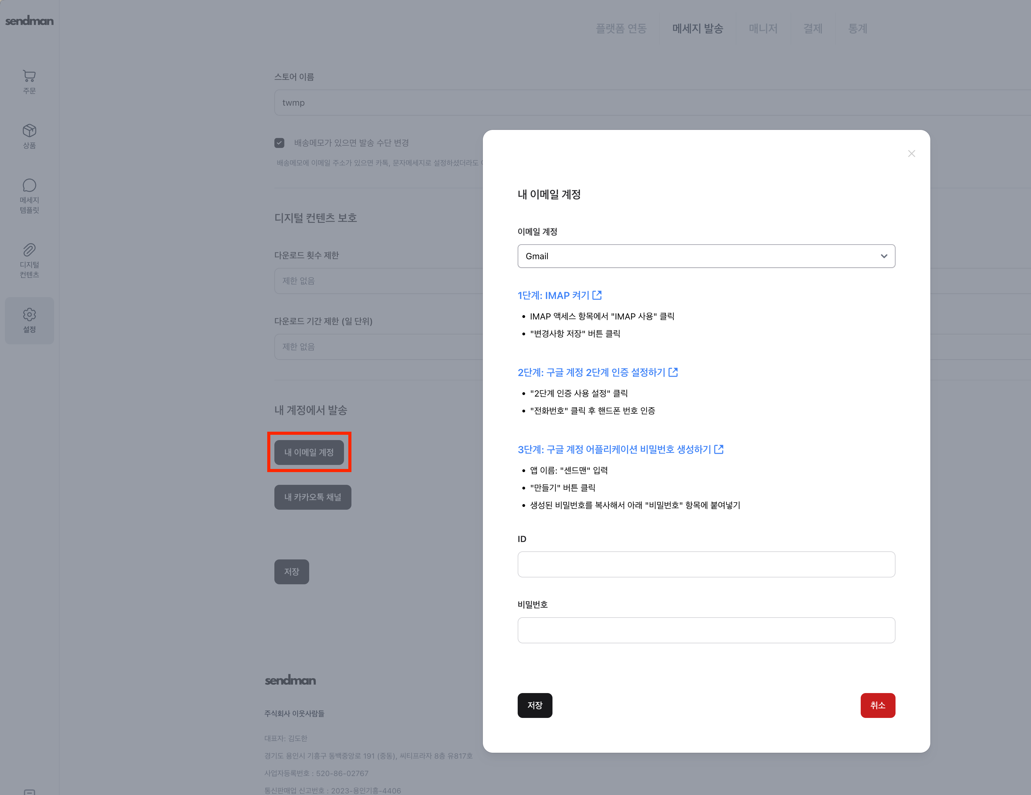 [설정] - [메세지 발송] 페이지에 접속하셔서 "내 이메일 계정" 버튼을 눌러주세요