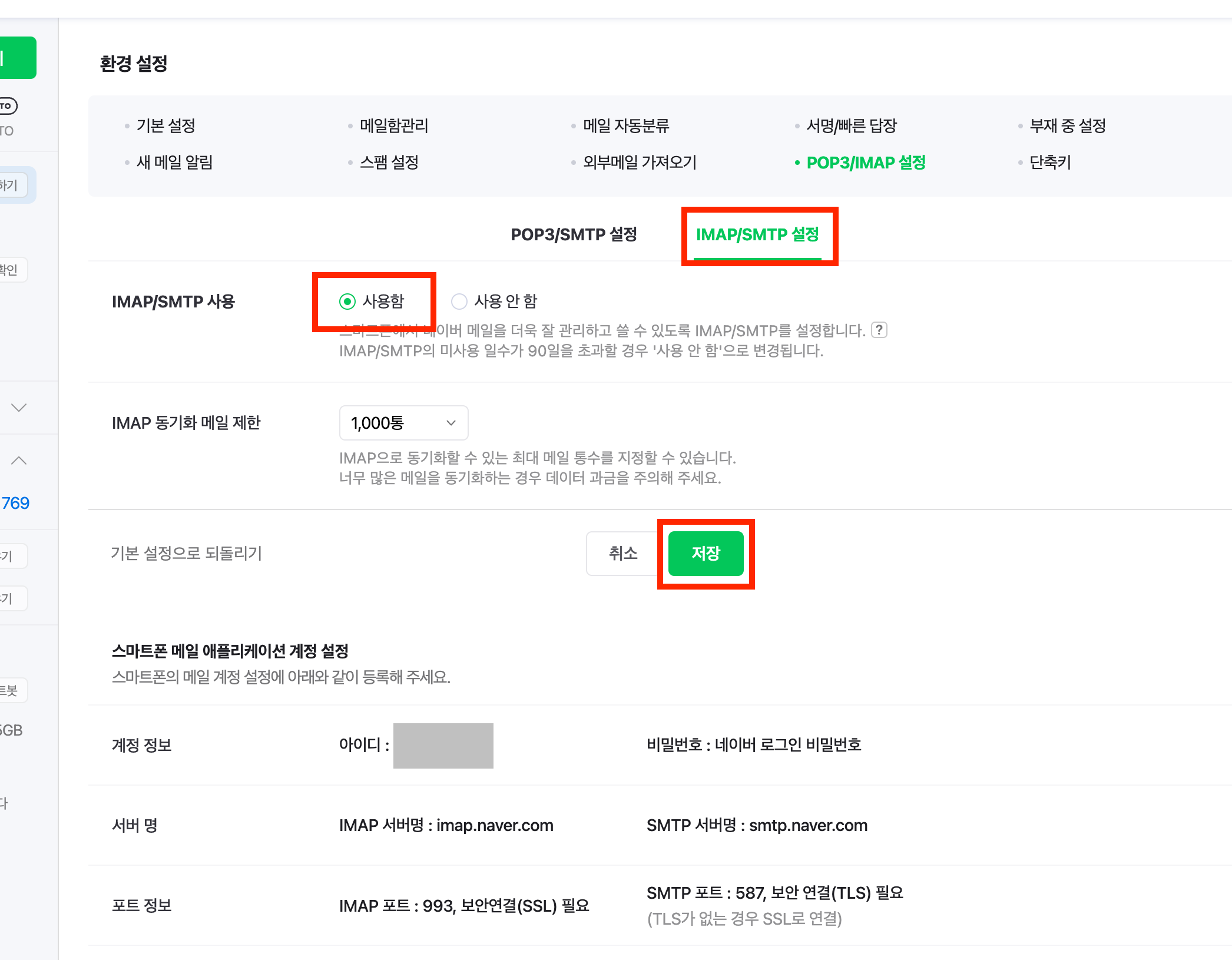 네이버 메일 IMAP/SMTP 설정으로 접속
