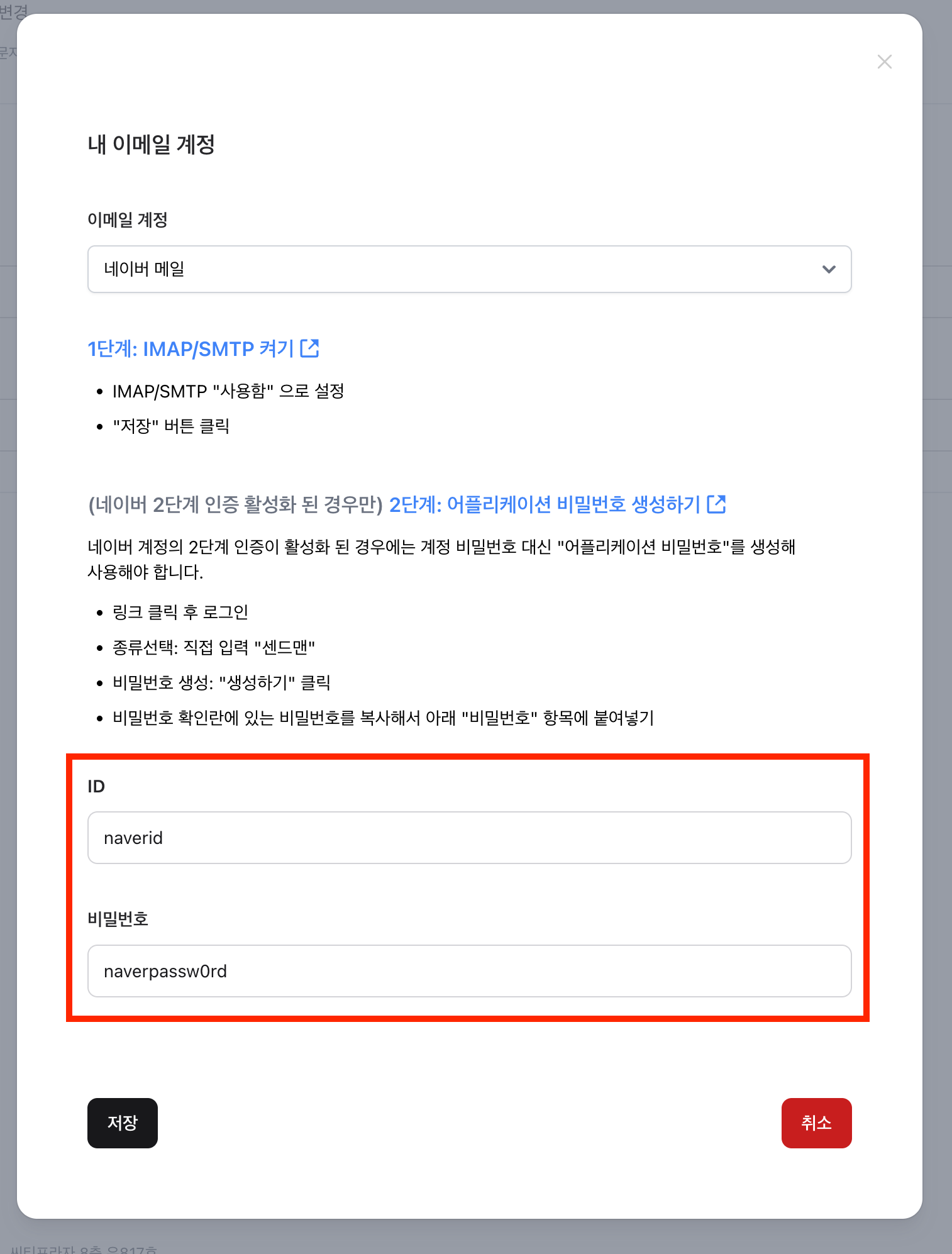 위에서 설정한 네이버 메일 계정 정보를 넣어주세요