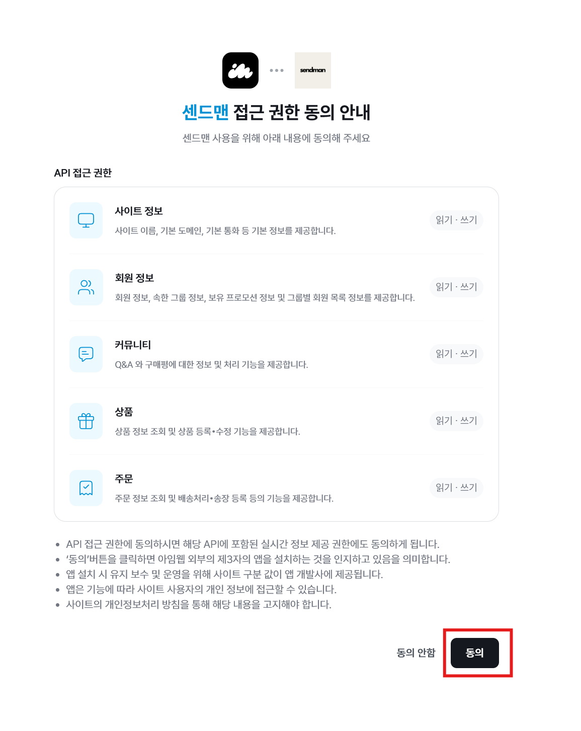 센드맨이 작동하기 위해 필요한 권한에 동의합니다.