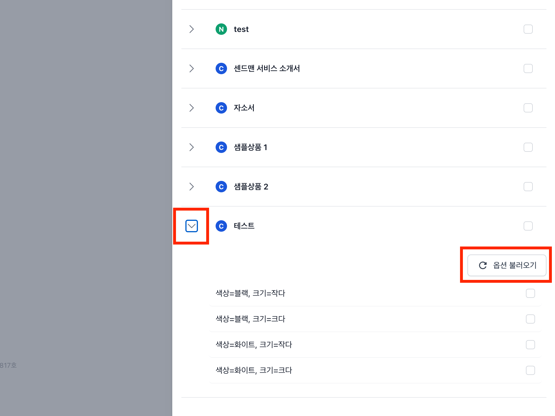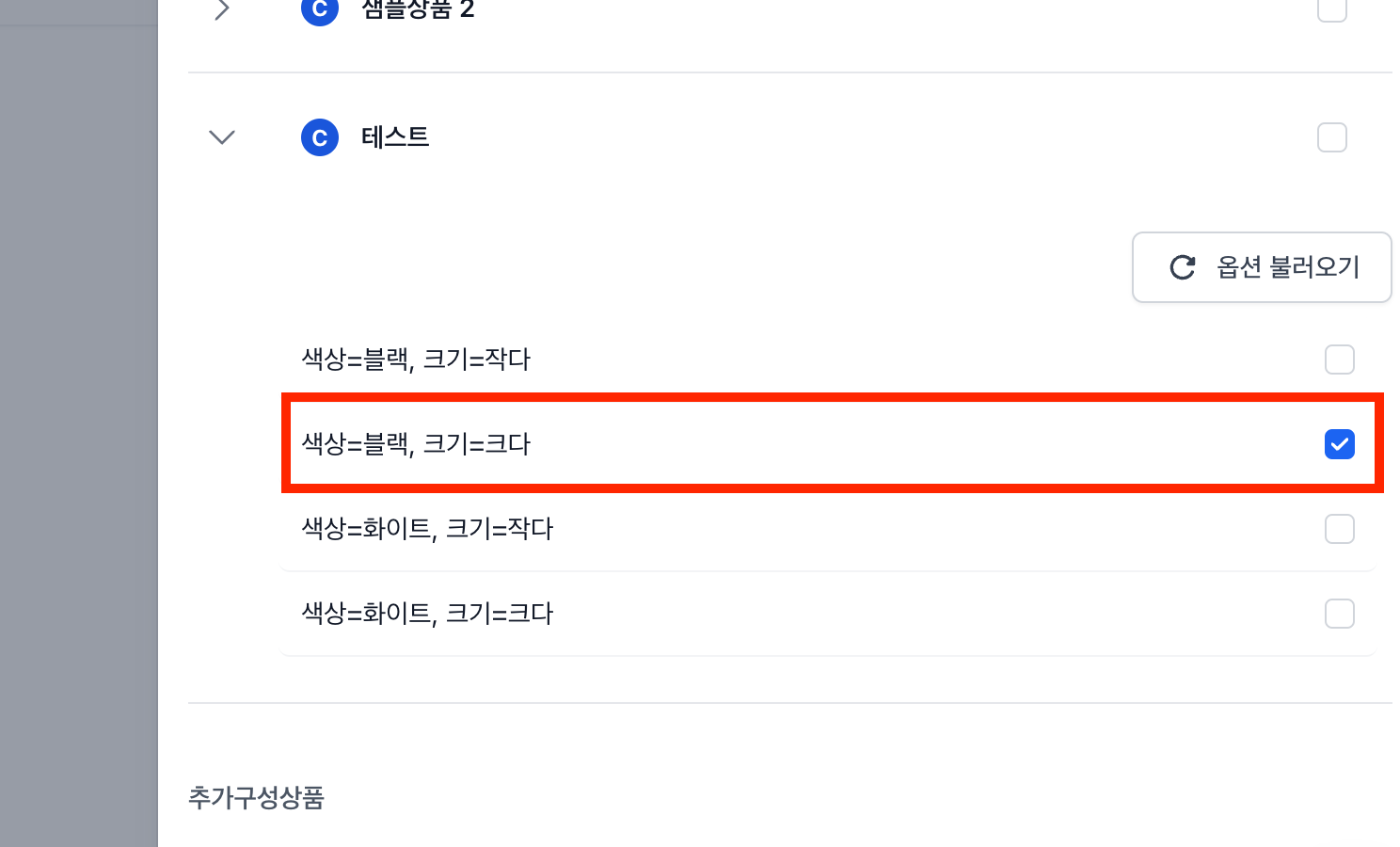 상품 이름 왼쪽의 화살표를 누르고, "옵션 불러오기" 버튼을 눌러주세요.