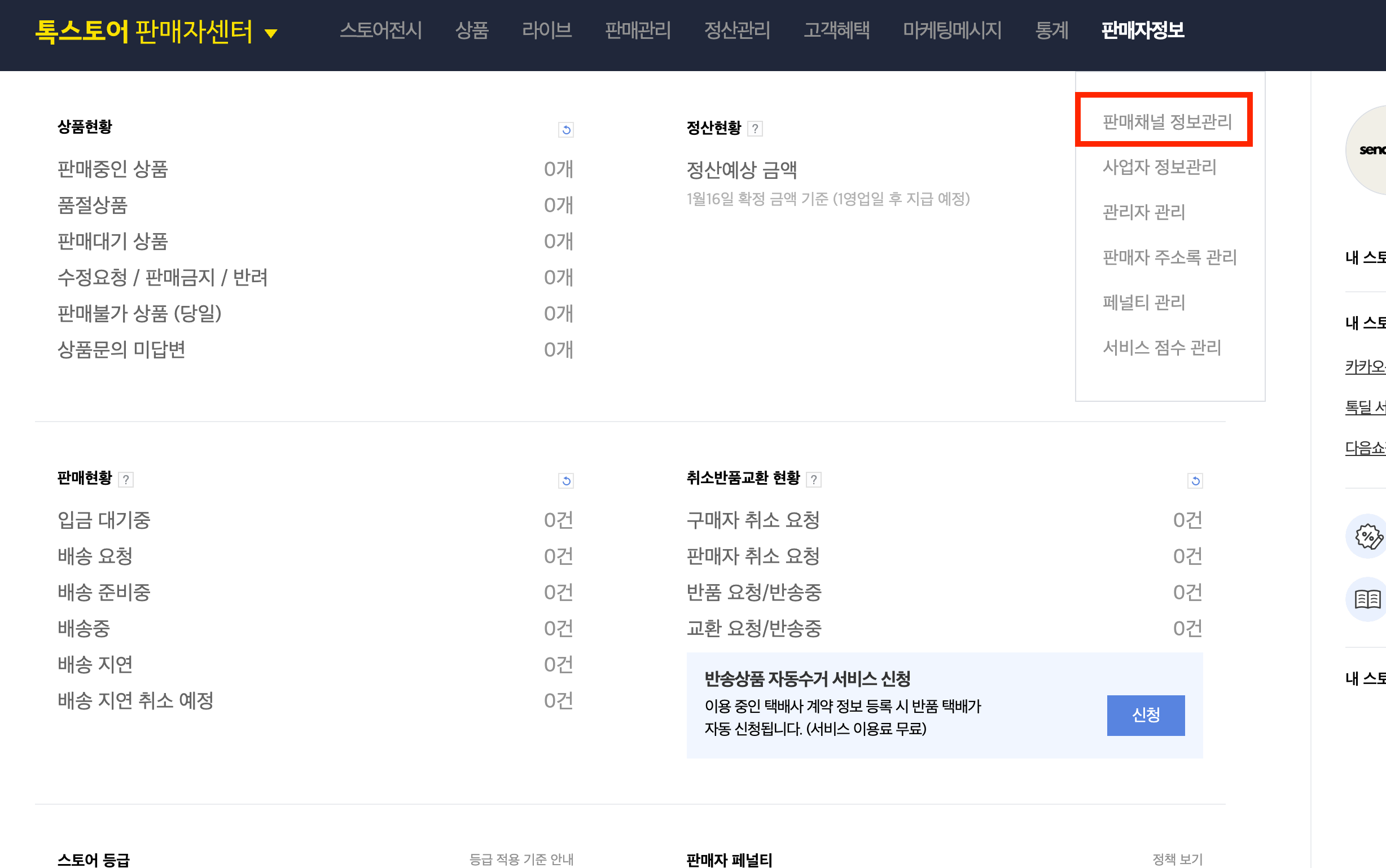 판매자정보 > 판매채널 정보관리 메뉴로 이동합니다.