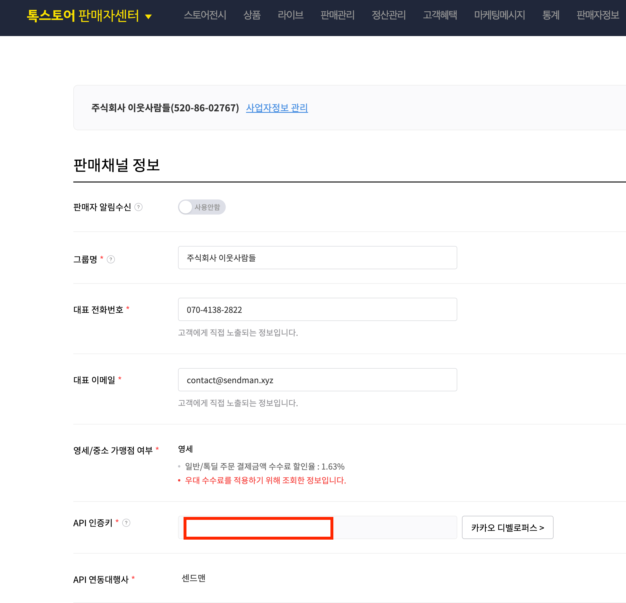 API 인증키를 발급한 후 센드맨 플랫폼 연동 페이지에 붙여넣습니다.