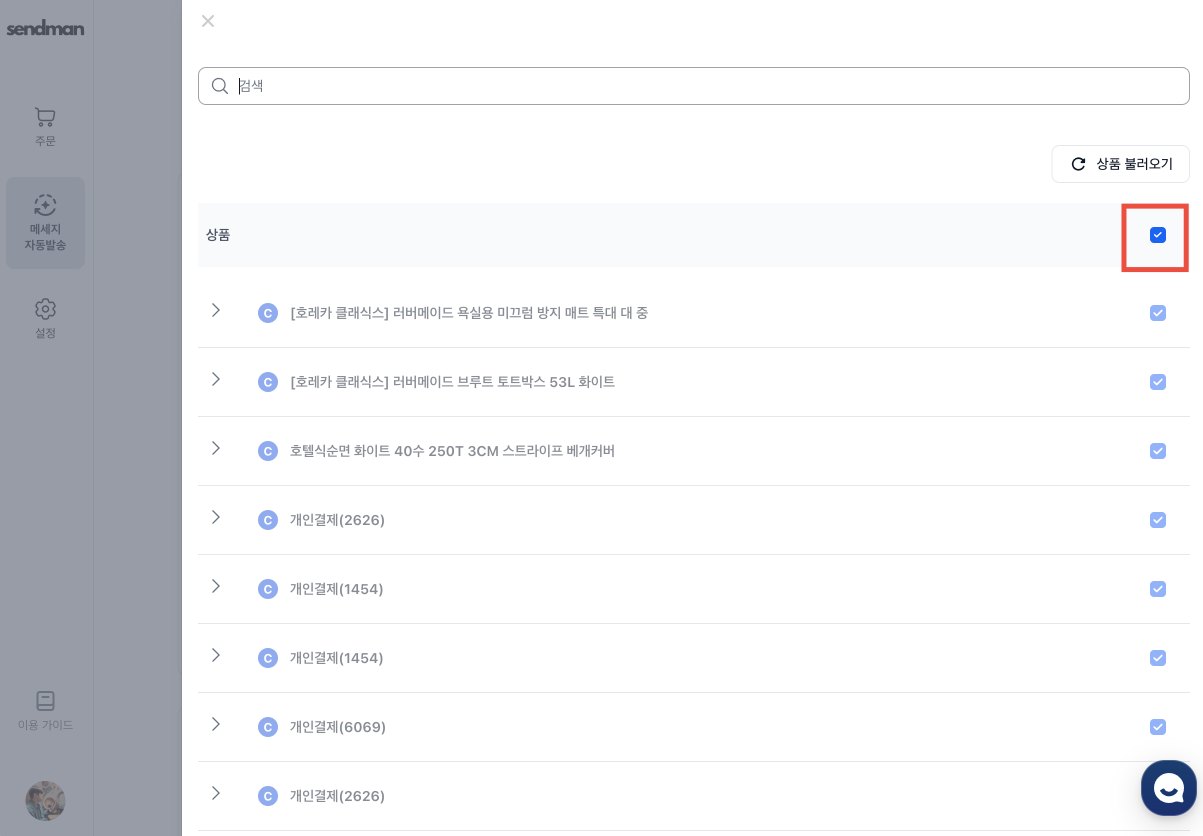 모든 상품에 같은 메세지를 설정하고 싶으신가요?이제 메세지 자동발송을 설정하실 때 많은 상품을 일일히 클릭해서 추가하실 필요가 없어요!상품 목록 가장 위의 체크박스를 선택하시면 모든 상품이 한 번에 선택됩니다.